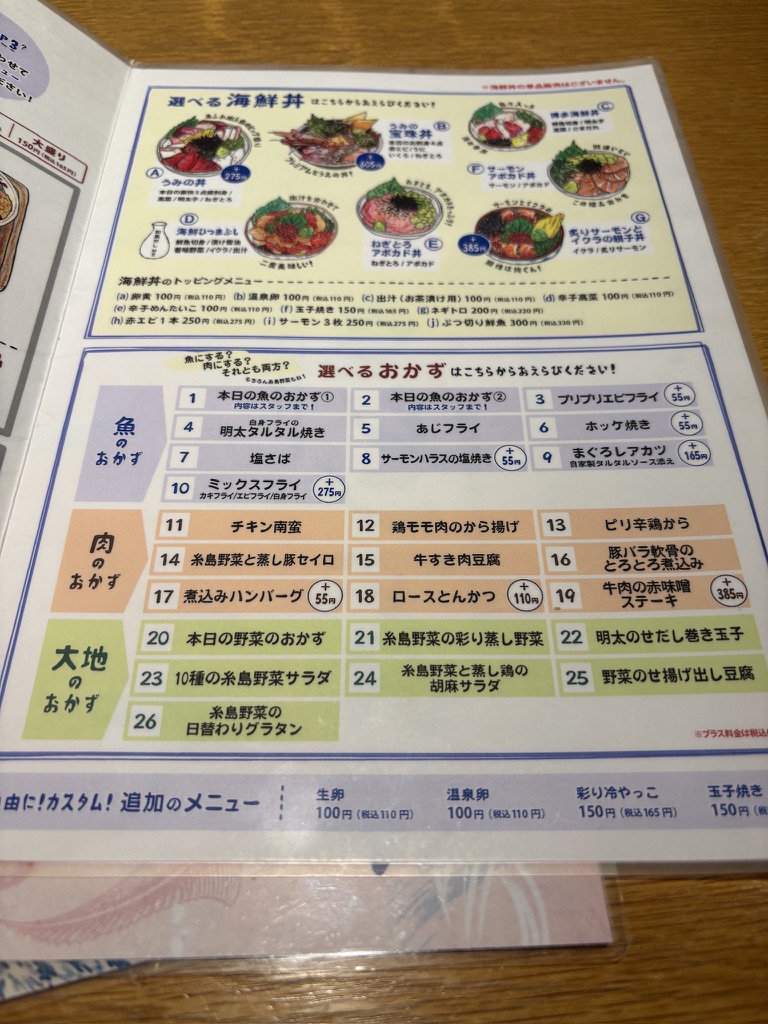 新鮮な海鮮丼や、好きなおかずを選べる定食が楽しめます。